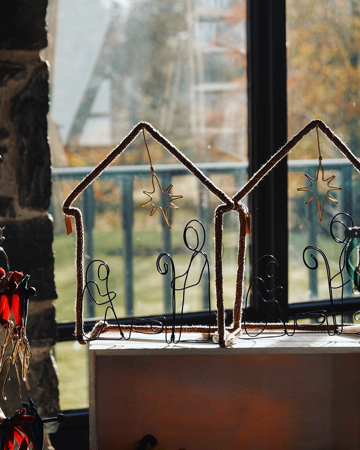 A tiny stable, carefully hand-shaped with wire and snugly wrapped in the softest 100% cotton yarn. Inside, you’ll find Mary, Joseph, and Baby Jesus, all delicately formed from black wire, standing proudly beneath a golden star that sparkles with holiday cheer.